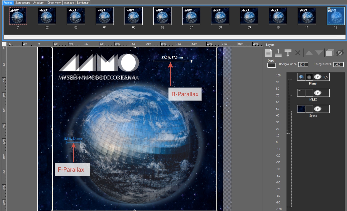 Parallaxes can be measured in various ways, for example, as a % ratio to the width of an image. This indicator is useful when the size of the print is unknown at the modeling stage. However, experienced printers can also tell the recommended parallax in physical quantities (in mm). This value is determined based on the experience of printing on specific materials and equipment. Victor from Stereograd.su informed of the optimal parallaxes for the lenticular lenses 75 lpi and the print equipment. Thus I made the layout exactly according to his recommendations.
