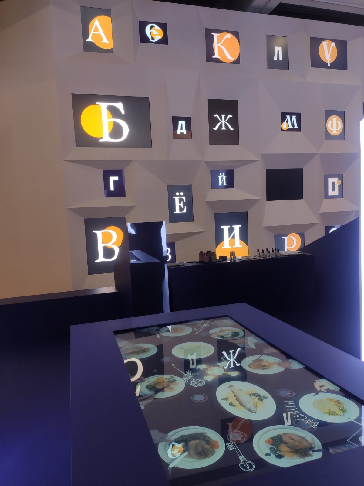 Фильм показывается в зале музея с помощью проекции на стол и предметы сервировки (горят свечи, на столе супница и блюда, еда в тарелках).